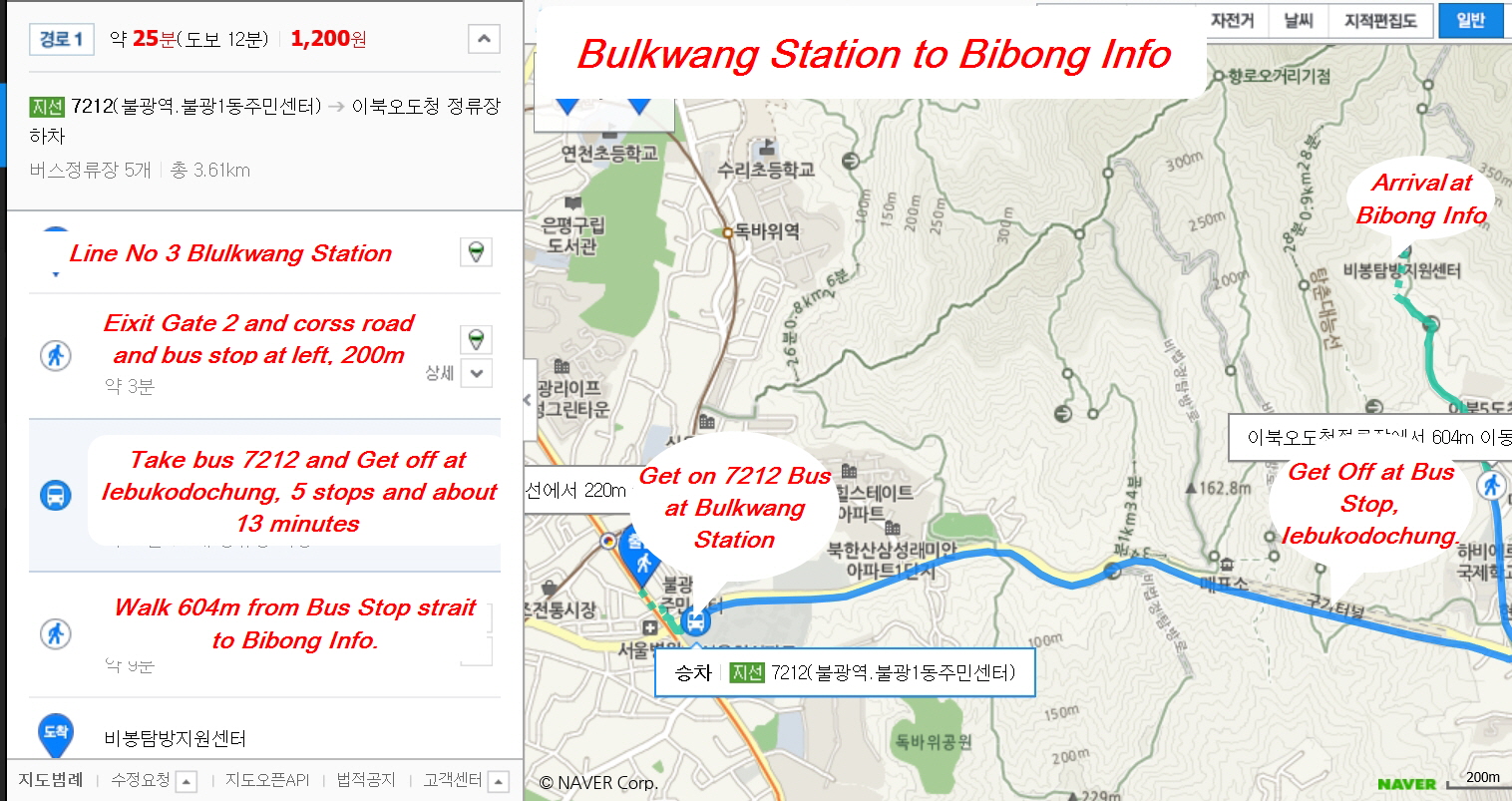 After that, from exit 2, walk across the street to Bulgwang station bus stop and take bus no. 7212 to The Committee For Five Northern Korean Province stop. Once you arrive at the bus stop, walk straight along the street for 10 minutes to reach Bibong Information Centre.