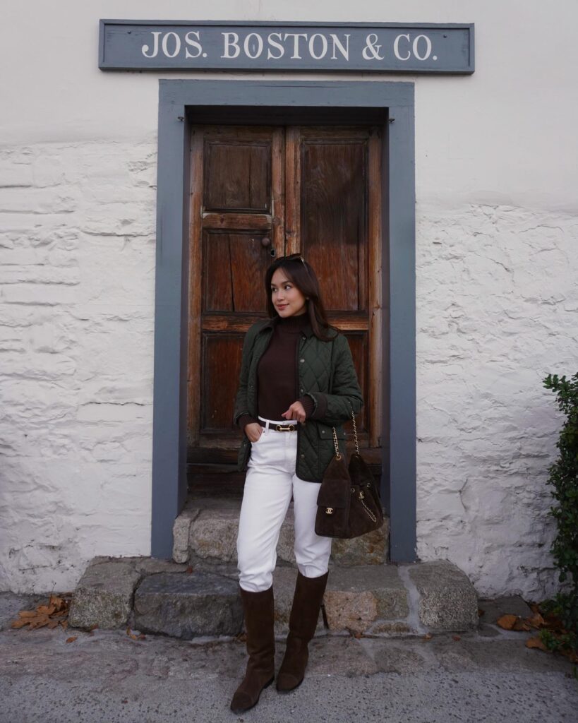 If you’re looking for a fresh way to style knee high boots outfits with winter pants, try white jeans!